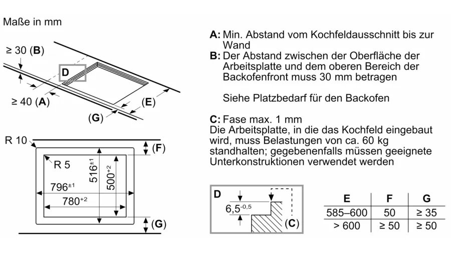 Erforderlicher Ausschnitt für die Installation (HxBxT mm): 56 x 796 x 516